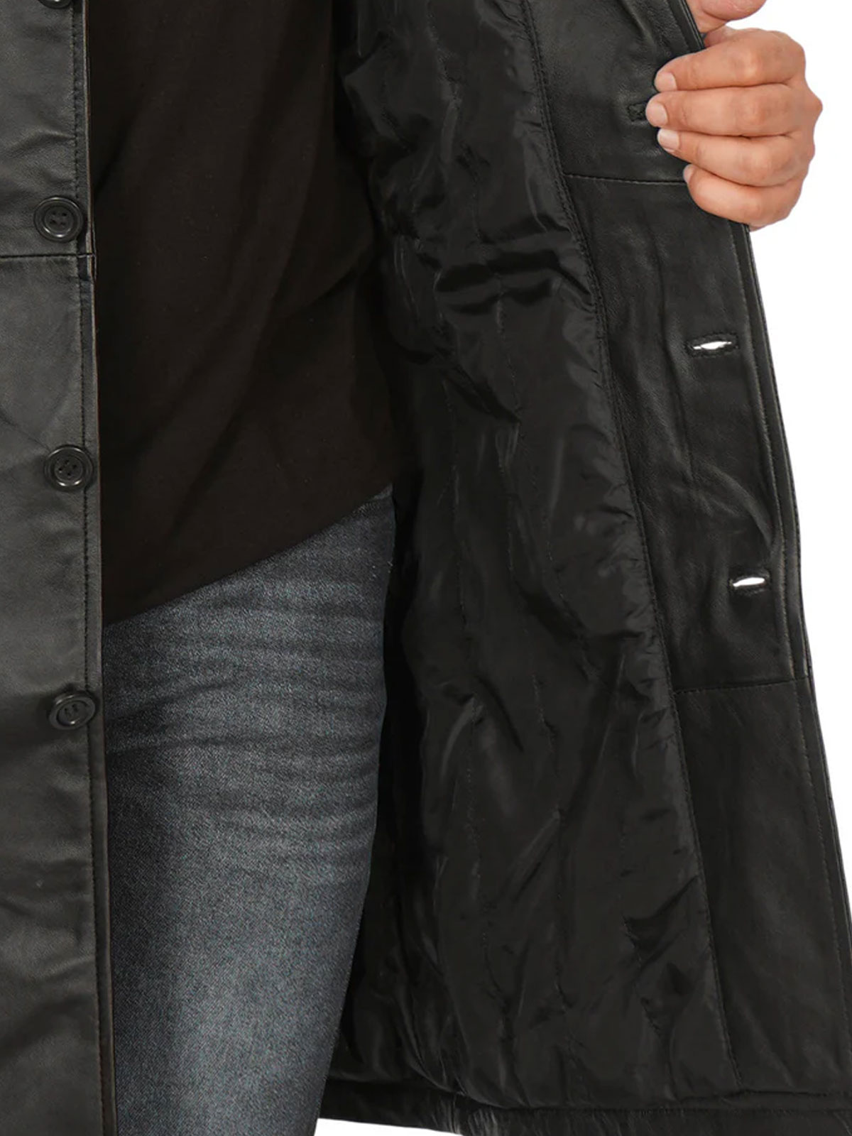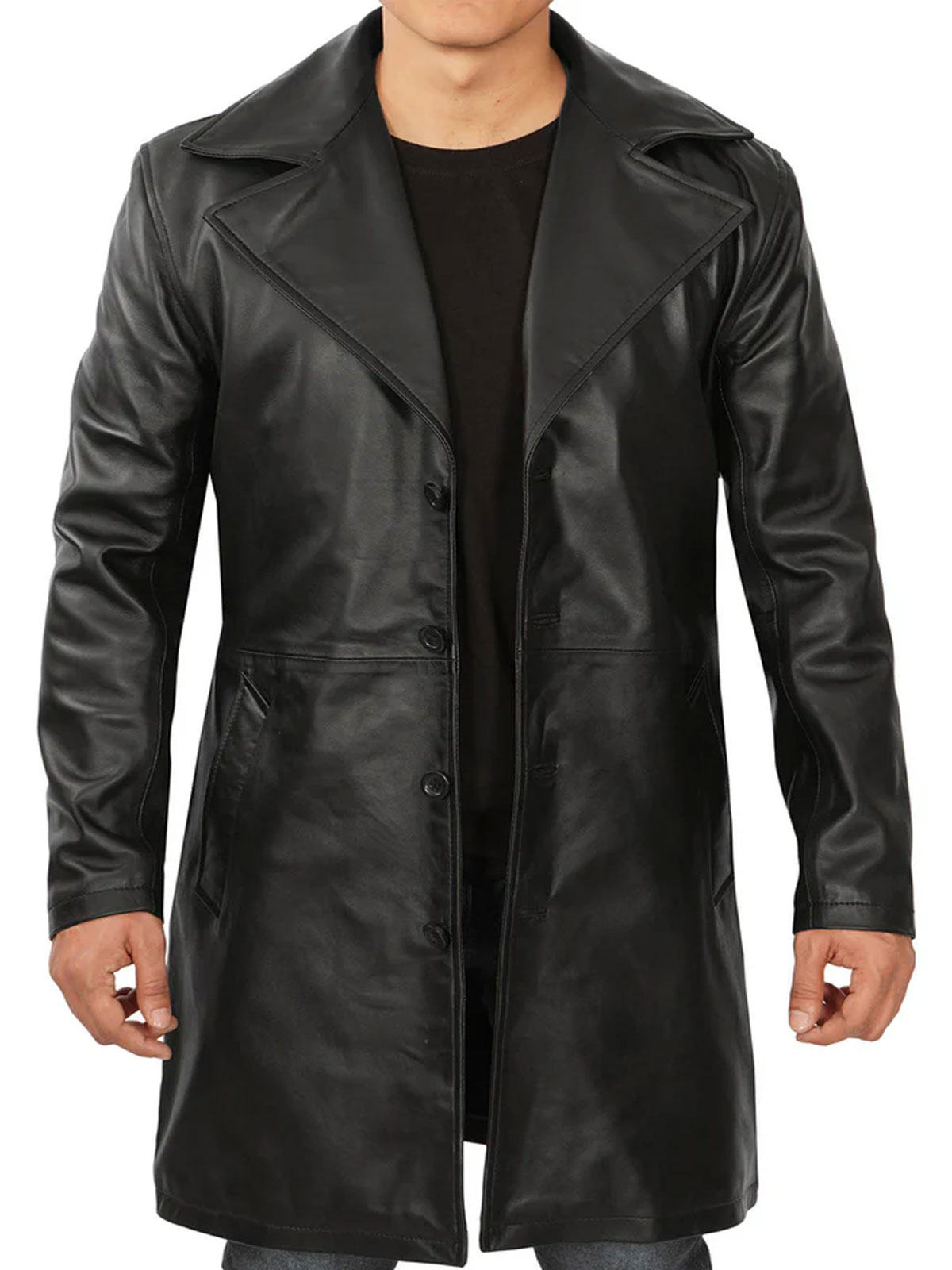 3/4 length, wide lapel collar and button closure.